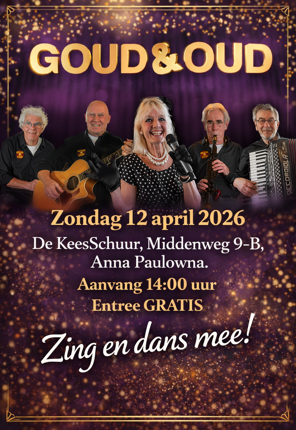 12 APRIL “GOUD & OUD’ 4 muzikanten en zangeres MARIANNE RIJNDERS staan weer in De Keesschuur om, net als afgelopen seizoen, opnieuw “een feessie te bouwen” De 4 muzikanten spelen op accordeon, gitaar, bas en percussie en Marianne zingt. Zij brengen repertoire uit de jaren ’60, van luisterliedjes tot meezingers.